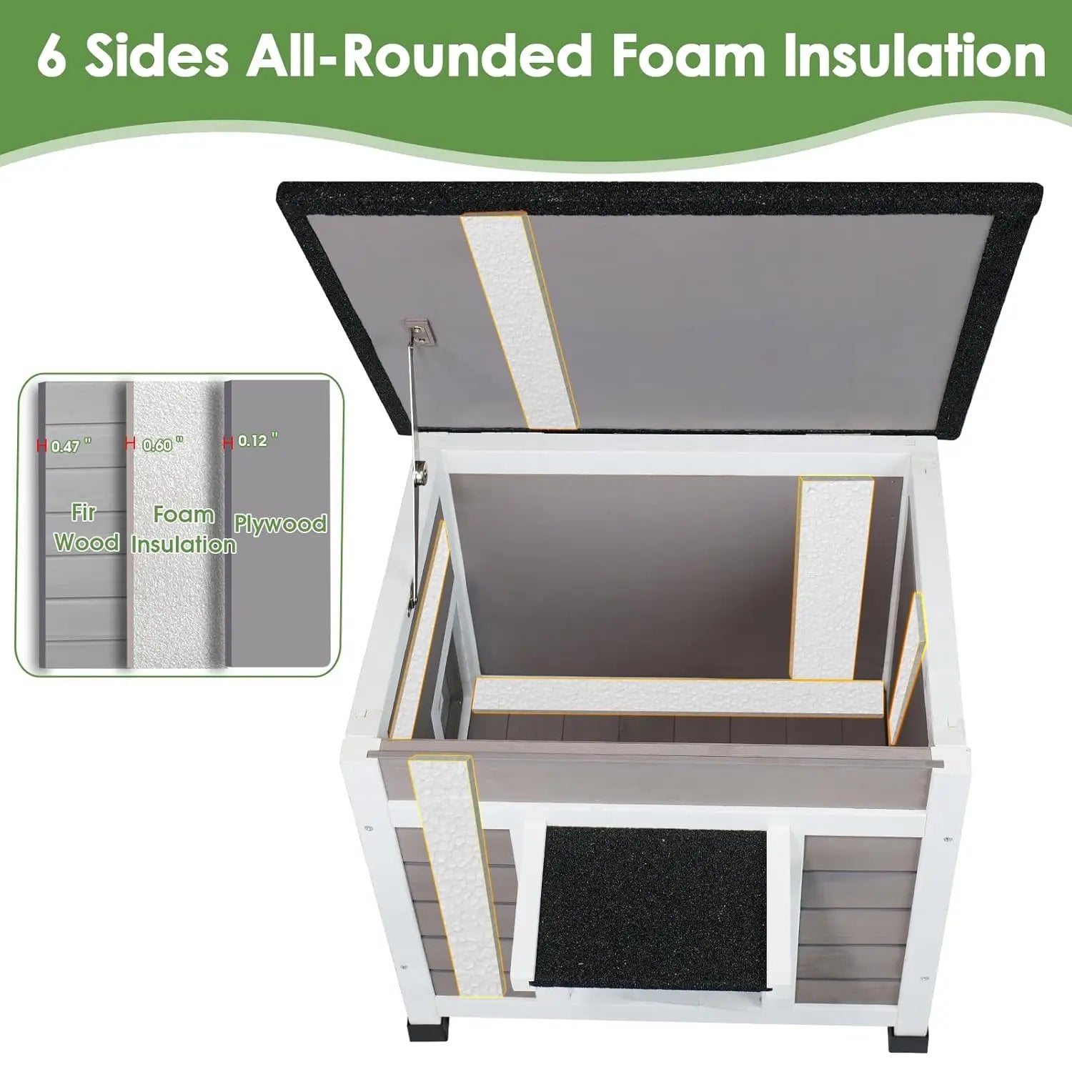 Insulated Cat House: The foam insulation material is not a separate lining but is sealed between the fir wood and plywood, ensures excellent heat resistance for year-round comfort. Just add a blanket for cozy winter nights.