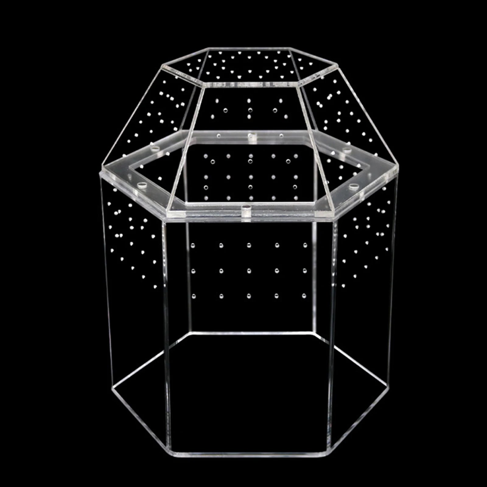Features: 1.360° Transparent Design: The jumping spider enclosure is crafted from high-quality acrylic, measuring 7.09*6.3*8.66 inches for a clear, tough, and abrasion-resistant build. Enjoy visibility to easily observe your pet's behavior, ideal for reptiles who love hiding in soil. 2.Effective Ventilation: This terrarium habitat features multiple side vents, ensuring your creatures Taking advantage of fresh air and constant airflow. The thoughtful vent design creates a healthy environment and reduces the risk of moisture buildup within the enclosure. 3.Versatile Application: Not only ideal as a tortoise enclosure, this transparent box effortlessly accommodates jumping spiders, snails, bearded dragons, tree frogs, and snakes. Create a dynamic space that suits the needs of various reptiles and amphibians. 4.Excellent for Bug Terrariums: The bug terrarium is easy to maintain and designed to display vibrant moss landscapes or support a diverse range of crawling and climbing pets. Its transparency lets you observe every moment and interact with your animals comfortably. 5.Secure Breeding Environment: Use this reptile breeding box to provide a safe and easy-to-clean home for your pets. The sturdy acrylic structure ensures durability while offering an ideal setup for successful reptile and small animal breeding. Specification: Origin: Mainland China Product Dimensions: 180.00 x 160.00 x 220.00 mm / 7.09 x 6.3 x 8.66 inches Material: Acrylic Note: Due to different monitor settings and lighting conditions, the actual color of the item may vary slightly from the pictures. Thanks for your understanding! Please allow a 1-2 cm difference in measurements due to manual measuring.