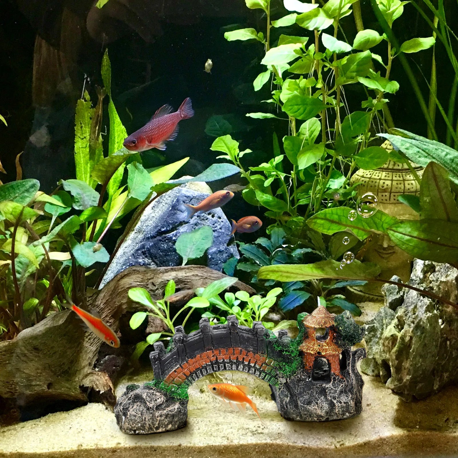 Durable Resin Construction: Crafted from top-quality resin material, the Resin Arch Bridge Pavilion Tree Fish Tank Landscape is built to withstand the aquatic environment. Its sturdy and durable construction ensures long-lasting performance, making it a reliable addition to your fish tank decor.